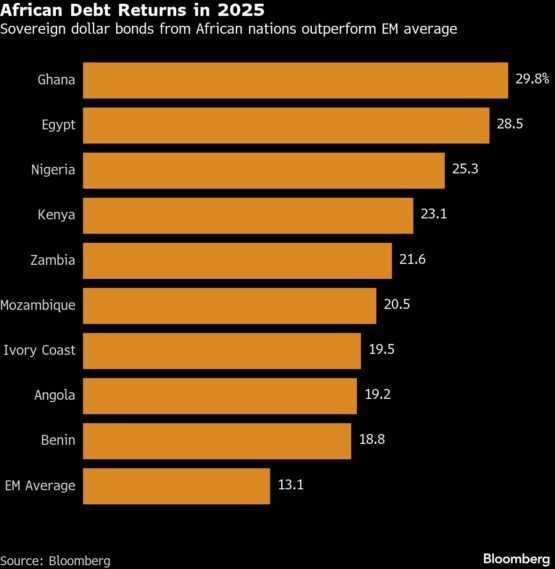 The gains came amid a banner year for emerging debt, where half of the sector’s top 10 performers were African. Sovereign dollar bonds from Ghana, Egypt, Nigeria, Kenya and Zambia returned more than 20%, data compiled by Bloomberg show, while in local bond markets, Nigeria and South Africa notched returns of about 40%.