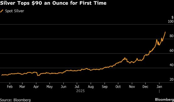 The white metal jumped as much as 5.3% to touch $91.5535 an ounce, while gold was within $10 of an all-time peak. Underlying US inflation in December wasn’t as high as feared, but economists said the data was artificially depressed by the record-long government shutdown. The Fed is expected to pause rate cuts for several months, but swaps markets are pricing in at least two more later in the year.