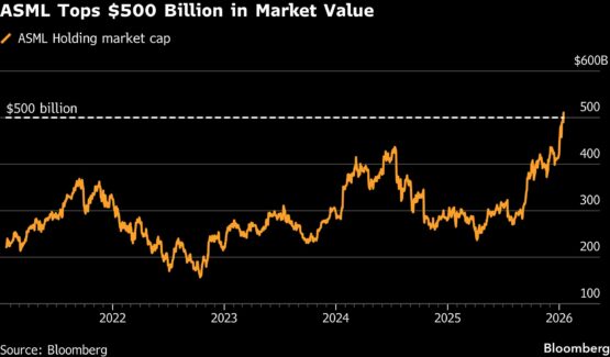 ASML Holding NV shares soared to a record high, sending its market value beyond $500 billion, after its key customer Taiwan Semiconductor Manufacturing gave a stronger-than-expected outlook for 2026.