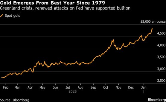 Trump’s brinkmanship over Greenland had sparked a diplomatic crisis with NATO allies in Europe and spooked financial markets, adding to gold’s appeal. The precious metal is still up more than 4% for the week, with geopolitical tensions fueling the continuation of a blistering rally that has seen bullion smash successive records over the past year.