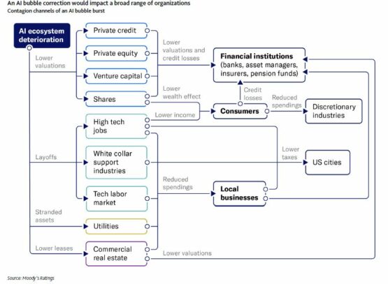Investors have poured billions of dollars into companies leading the artificial intelligence boom, and a sharp drop in valuations would have dire consequences for the credit market and the broader US economy, according to Moody’s Ratings.