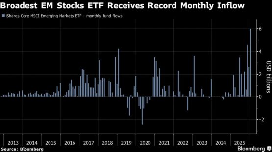 Investors are pouring cash into emerging-market funds at a record pace as momentum builds for a rotation out of US holdings. It’s sent the EM stocks gauge to a record high.