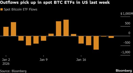 Spot Bitcoin exchange traded funds saw five consecutive days of outflows totaling $1.7 billion last week in the US, almost wiping out the previous four days of inflows, according to data compiled by Bloomberg.