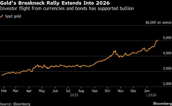 Gold rose, holding above $5 000 an ounce for a second day, as a weak US dollar helped to extend a blistering rally fuelled by geopolitical risks and investor flight from sovereign bonds and currencies.