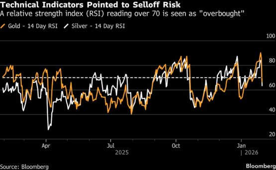 Gold’s move “validates the cautionary tale of fast-up, fast-down,” said Christopher Wong, a strategist at Oversea-Chinese Banking Corp. While reports of Warsh’s nomination were a trigger, a correction was overdue, he said. “It’s like one of those excuses markets are waiting for to unwind those parabolic moves.”