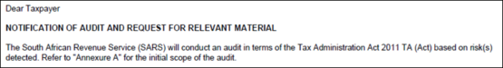 Excerpt from a Sars issued Notice of Audit on Personal Income Tax, dated March 2024
