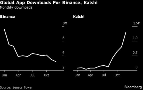 That shift is playing out in the numbers. While crypto exchange app downloads fell sharply last year, prediction markets moved in the opposite direction. Polymarket’s installs climbed from 30 000 in January to more than 400 000 by December, according to market intelligence firm Sensor Tower. Kalshi’s installs ballooned from 80 000 to 1.3 million over the same time. Binance, the world’s biggest crypto exchange, saw downloads cut by more than half.