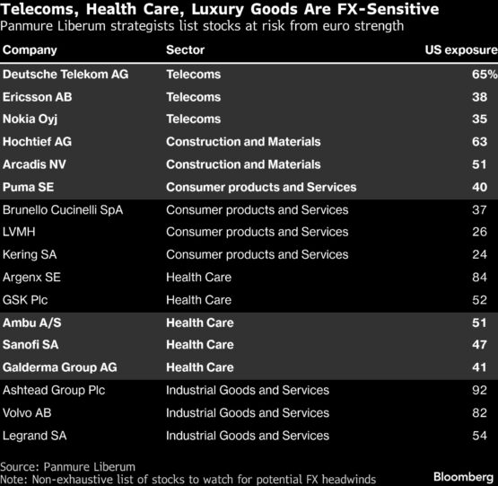 An analysis by Citigroup Inc. strategists shows that a 10% rise in the euro versus the dollar could reduce European earnings per share by about 2%. Companies in the commodities, food and beverage, health-care, luxury goods and auto sectors are among the most exposed, they found.
