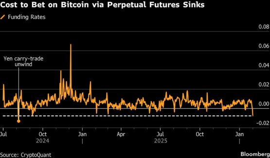 Bitcoin perpetual futures — derivatives that do not expire and make up the bulk of crypto trading volume — also signal a more pessimistic mood in the market. Funding rates, which help keep the contracts’ prices aligned with Bitcoin, have turned negative, falling to their lowest level since the August 2024 unwind of the yen carry trade, according to CryptoQuant data. When rates turn negative, short sellers make up the majority of the market and pay those holding long positions to keep their trades open.