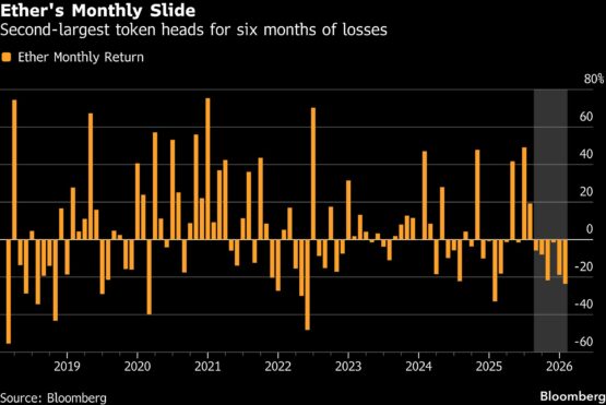 Ether has posted negative monthly returns since September, and is headed for six consecutive months of losses. January marked its longest such streak since Bloomberg began tracking the token in 2018.