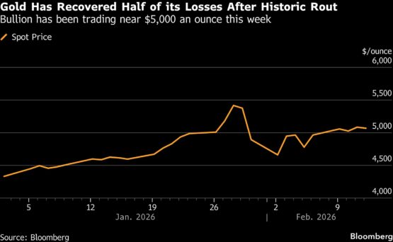 Despite falling, gold continued to hold above $5 000 an ounce and has clawed back around half of the losses sustained during a historic rout at the turn of the month. The precious metal surged to a record high above $5 595 in late January before a wave of speculative buying saw the rally get overheated. Bullion then plunged about 13% in two sessions.