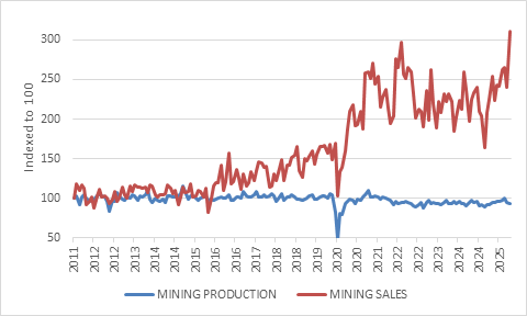 On the other hand, mining sales have jumped thanks to elevated precious metals prices. This is good for the trade balance, the fiscal balance and domestic financial markets.