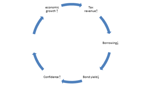 Therefore, achieving taster economic growth remains key to putting government finances on a sound footing over the longer term and turning the vicious cycle into a virtuous cycle of falling borrowing costs and faster growth as shown in the following chart.