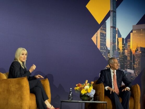 Journalist Bronwyn Nielsen in conversation with Ninety One founder and CEO Hendrik du Toit. Image: Liesl Peyper/Moneyweb