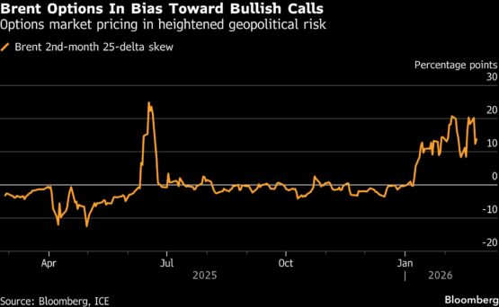 Oil has been caught between bearishness from widespread expectations for a global glut this year and heightened geopolitical concerns over Iran. Some of that risk is showing up in the options market, with skews still biased toward bullish calls as implied volatility stays elevated.