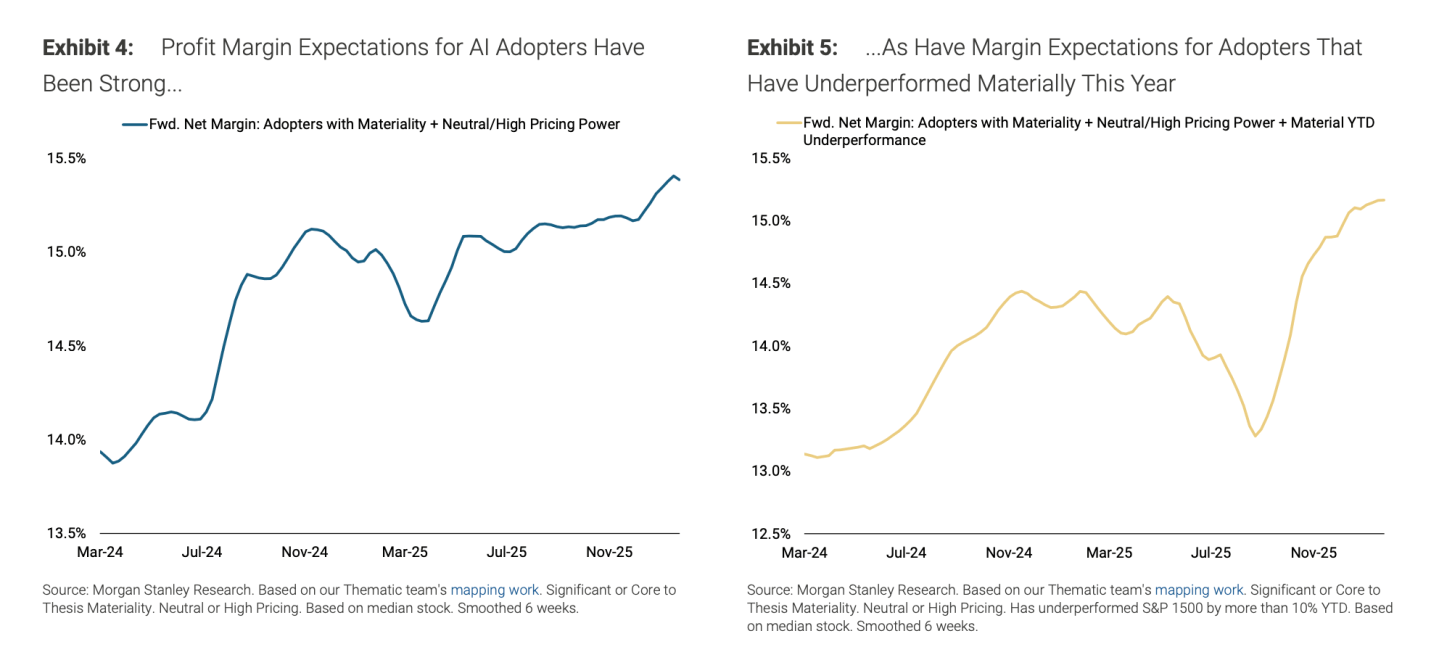 Morgan Stanley cites evidence that corporate America is already reaping tangible rewards from AI adoption. By the fourth quarter of 2025, 30% of companies identified as AI “adopters” reported quantifiable financial or productivity benefits from the technology, up from just 16% a year prior. As a result, forward profit margin expectations are actively accelerating for companies successfully utilizing AI. How those margins continue to increase, and how many new jobs those companies create as a result, will bear out whether Morgan Stanley’s prediction is right.