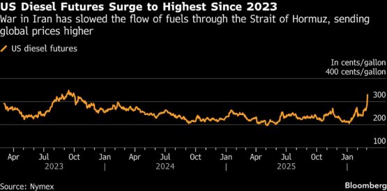 Prices for diesel have reacted strongly to the conflict in the Middle East, in part because the Strait of Hormuz is a key route for large volumes of the fuel produced at nearby refineries. The shipping constraints are tightening the global market, with supplies already low on the US East Coast after an abnormally cold winter. Transit costs are also soaring: The rate for carrying petroleum product from the Middle East Gulf to Northwest Europe jumped to its highest since 2024 on Monday.