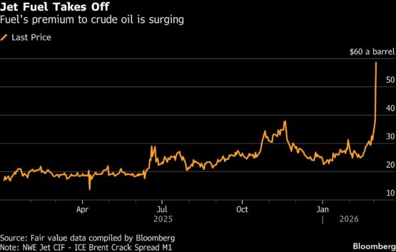 Diesel isn’t the only petroleum product experiencing a price surge. In northwest Europe, jet fuel’s premium to crude oil soared north of $60 a barrel, the strongest it’s been since 2022, according to fair value data compiled by Bloomberg.
